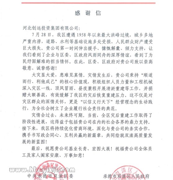 近日,承德市雙灤區(qū)區(qū)委、區(qū)政府向河北創(chuàng)遠(yuǎn)投資集團(tuán)發(fā)來(lái)感謝信,對(duì)創(chuàng)遠(yuǎn)集團(tuán)在今年抗洪搶險(xiǎn)期間第一時(shí)間伸出援手、與區(qū)委、區(qū)政府和當(dāng)?shù)厝罕婏L(fēng)雨同舟的深厚情誼,表達(dá)了誠(chéng)摯的感謝。